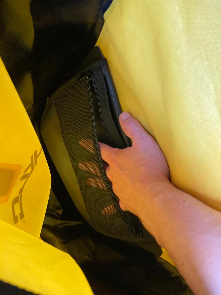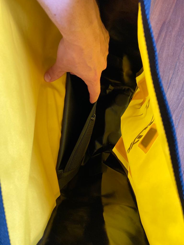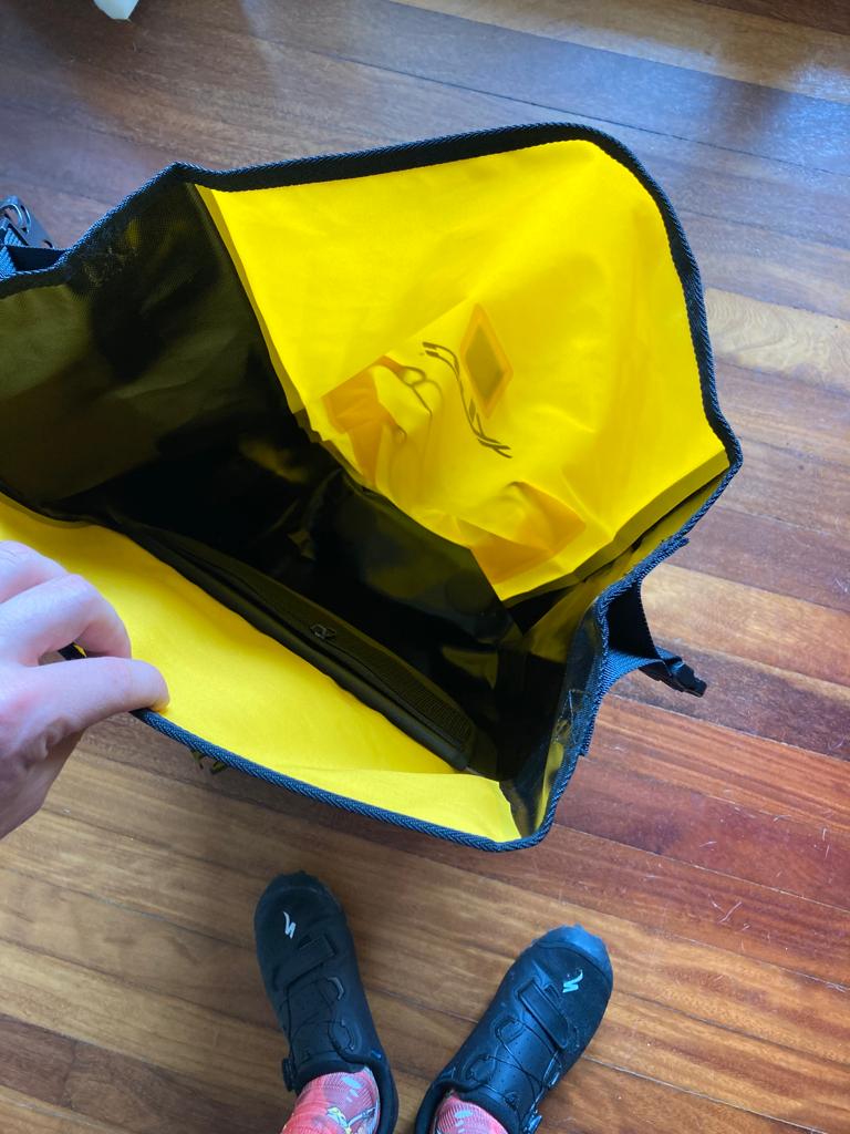 En plus de l’imperméabilité, ces sacoches présentent deux autres caractéristiques qui se font remarquer. C’est un équipement très volumineux : deux sacoches de 20 litres. Je vous laisse calculer le total… À l’intérieur, il n’y a pas de sous-division, à part deux petites poches pour garder vos affaires importantes dont une en maille.