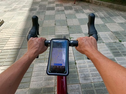 Une fois le système mis en place, j’ai commencé à manipuler mon téléphone portable. La pochette permet de naviguer sur son écran tactile sans aucun souci et est très efficace en termes de protection. Elle est étanche et transréflective : les reflets du soleil ne vous gêneront pas, tant que vous êtes généreux sur la luminosité.